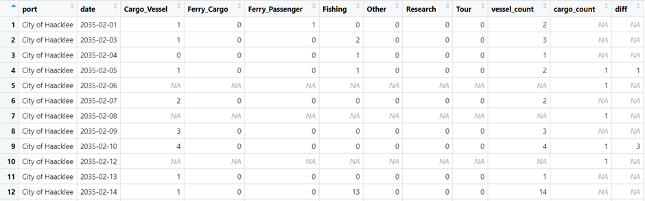 Drilling into mini-challenge 2, sub-question 1, the team surfaced challenges mapping the vessels and cargo at each port based on the individual date. As illustrated in the data table below, the count of vessel and cargo at each port on the same date varies.