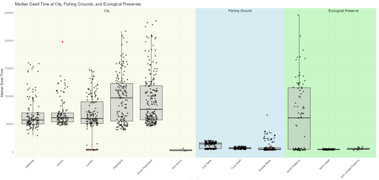 - Colors on boxplot background allows users to quickly identify the type of geographical region in relation to Oceanus map. (e.g., Beige for cities, light blue for fishing grounds and light green for ecological preserves).
