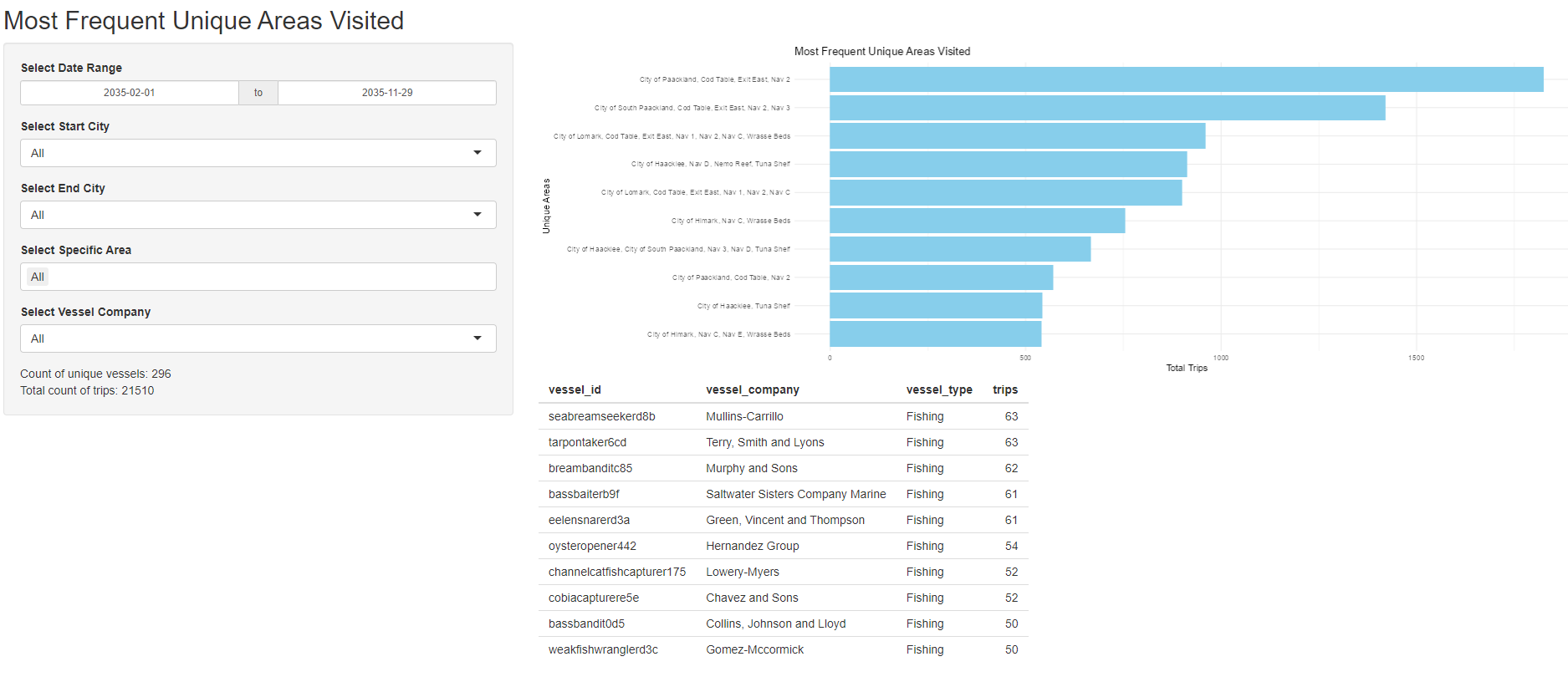 - Helps users identify which vessels in the company are active at which location in which months. (e.g., For Bernett, Jones and Millet company, only Perch Plunderer was active in Wrasse Bed, while Brine Bucaneer is active in Cod Table).